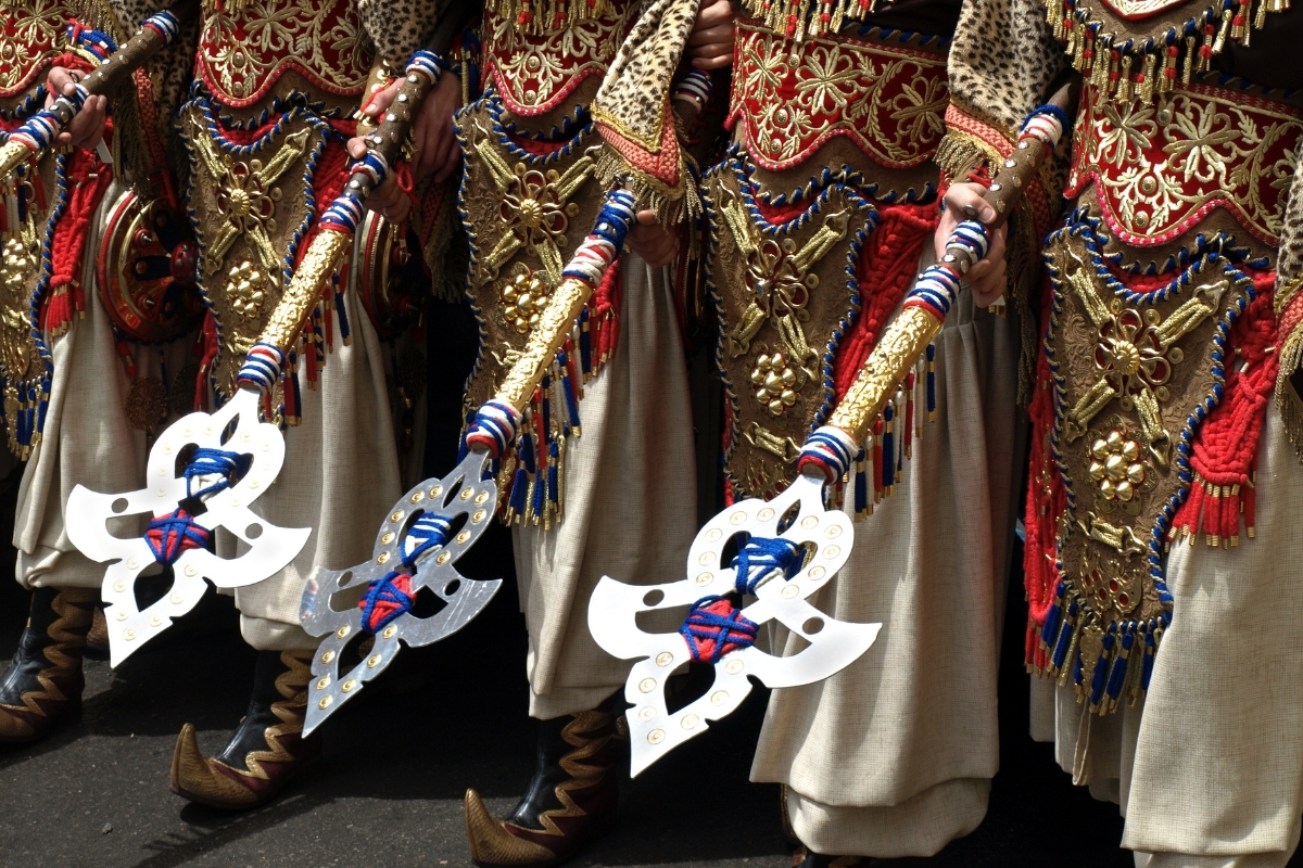 Праздник Мавры и Христиане – это настоящий погружение в историю, достижимое благодаря вниманию к деталям. Центральное место занимают костюмы участников. Каждая filà имеет свой уникальный костюм, часто вдохновлённый либо реальными историческими образцами, либо романтическими представлениями о средневековье. С «мавританской» стороны можно увидеть роскошные наряды, напоминающие о мавританской Испании и Аравии: расшитые кафтаны, шаровары, тюрбаны с перьями, ятаганы и щиты, иногда экзотические маски. Многие мавританские группы воплощают образы восточных народов – например, фили «Tuareg» одеваются в стилизованные костюмы туарегов пустыни, «Berberiscos» – в образ берберских пиратов, «Almorávides» – как воины династии Альморавидов. Христианские filaes противопоставляют им образы рыцарей и авантюристов: тамплиеры шествуют в плащах с красным крестом, «Almogávares» – как каталонские наёмники, «Contrabandistas» и «Marinos Corsarios» – в морском пиратском стиле XVIII века, с мушкетами и шляпами-треуголками. Кульминацией каждой группы являются капитан и alférez (знаменосец) – их костюмы самые пышные, часто инкрустированные блёстками, с коронами или шлемами и огромными знаменами в руках. Эти лидеры олицетворяют героев праздника и весь год готовятся к своей роли.