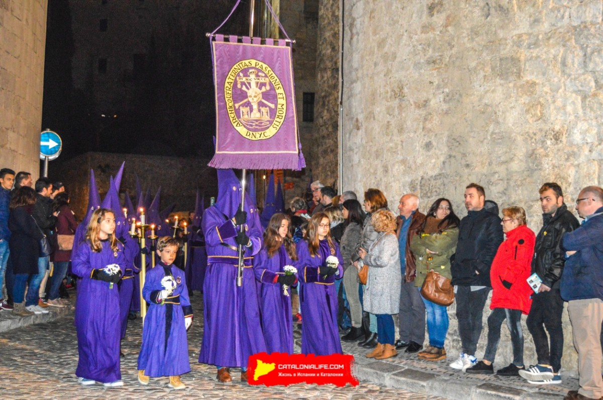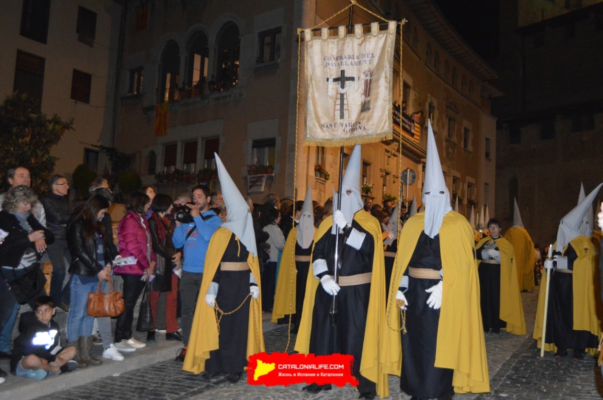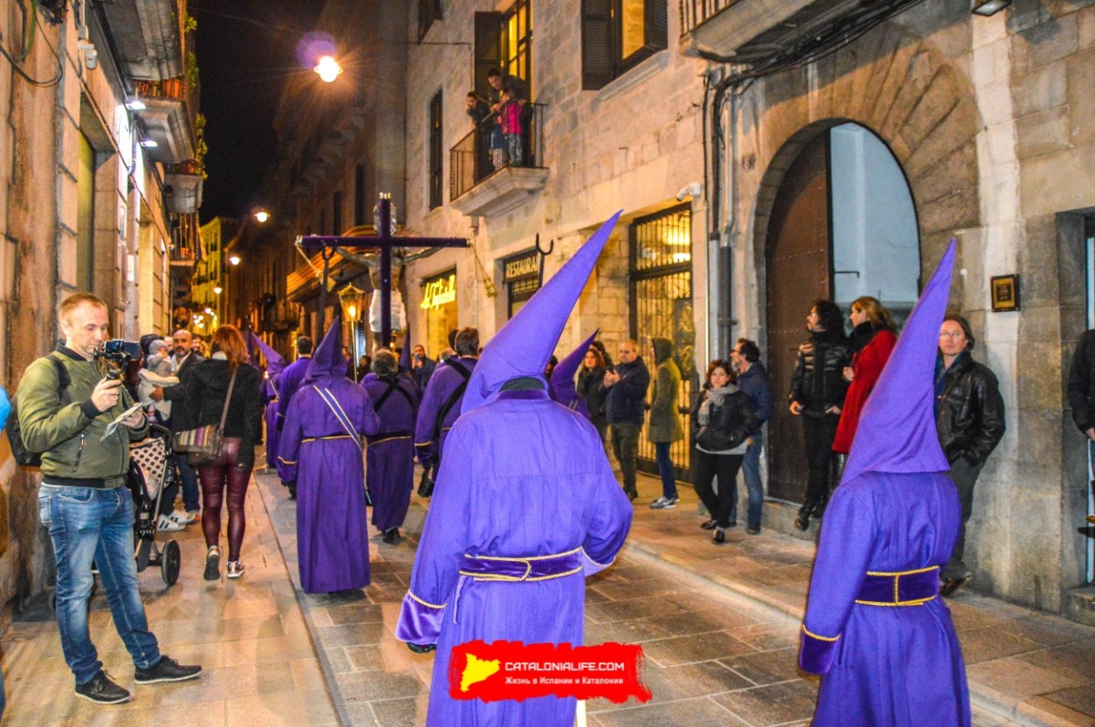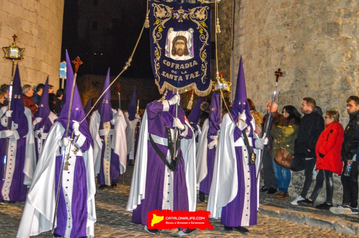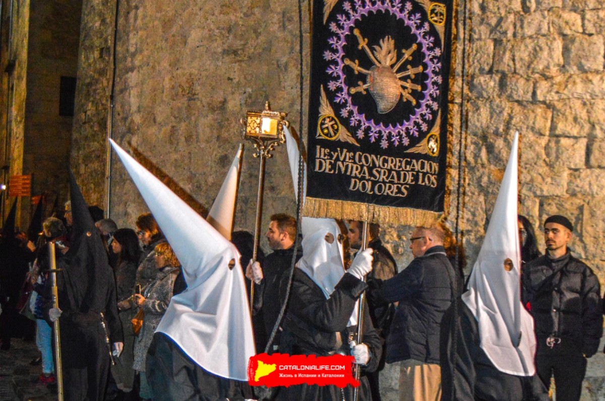 Особое внимание привлекает форма братства — один из самых узнаваемых элементов процессии. Это лилово-фиолетовая туника с белой полосой и белая накидка с крестом Святого Иакова (creu de Santiago).